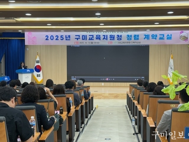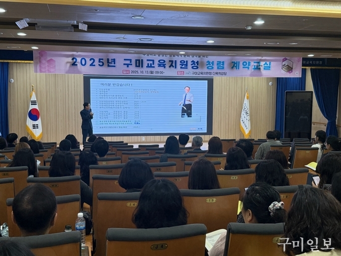 경상북도구미교육지원청(교육장 민병도)은 10월 13일 구미교육지원청 신청사 1층 다목적강당에서 관내 학교 계약업무 담당자를 대상으로 ‘2025년 구미교육지원청 청렴 계약교실’ 연수를 실시하였다.