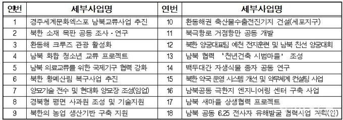 경상북도 남북교류협력사업계획(안)에는 경북도의 강점 분야인 농업, 산림, 문화․관광 등 다양한 분야의 사업들이 포함된 것으로 알려졌다.