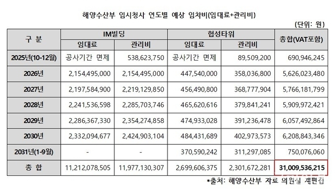 임대 보증금은 총 29억 5,834만 원으로 임대료와 관리비를 합한 연간 임차비는 51억 1,456만 원이며, 계약 기간은 IM빌딩(지하4층·지상22층 건물 전부)이 2030년 12월 31일, 협성타워(2·3·4·8·12·13층 전체)는 2031년 9월 30일까지로, 임대료는 매년 2%, 관리비는 3% 인상 조건으로 체결됐다. 이를 임대 기간 전체로 환산하면 약 310억 원에 달하며, 이는 웬만한 지방자치단체 청사를 새로 지을 수 있는 정도의 규모다.