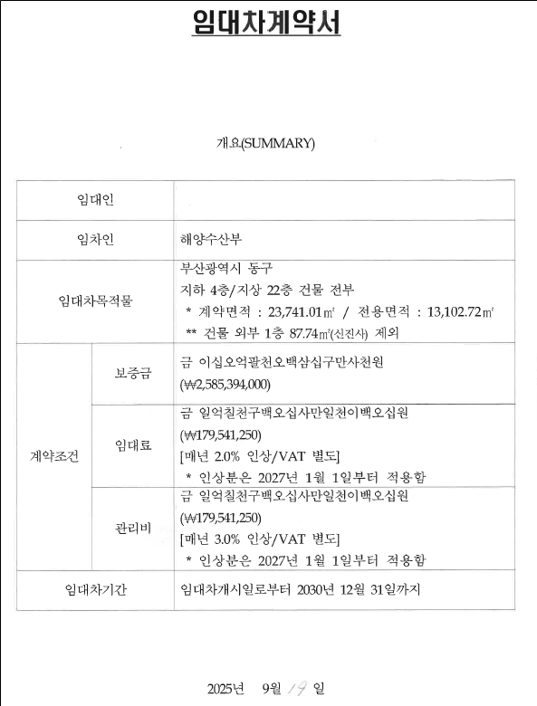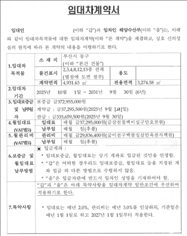 국회 농림축산식품해양수산위원회 소속 강명구 국회의원(국민의힘·구미을)이 해양수산부로부터 제출받은 부산 이전 청사 임차 계약서를 분석한 결과, 해양수산부는 지난 9월 19일 IM빌딩(본청)과 협성타워(별관) 두 곳과 임차 계약을 체결한 것으로 확인됐다.