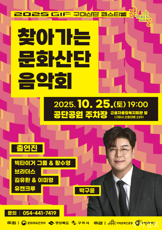 무대에는 트로트 가수 박구윤을 비롯해 지역의 실력파 예술인들이 함께한다. 퓨전 재즈밴드 ‘빅타이거 그룹’, 보컬리스트 황수영, 청년 금관앙상블 ‘브라더스’, 성악가 김유환(바리톤)과 이미영(소프라노), 구미 대표 댄스팀 ‘유캔크루’ 등이 참여하며, 특히 박구윤은 ‘뿐이고’, ‘나무꾼’, ‘인생 면허증’ 등 다수의 히트곡으로 사랑받아온 정통 트로트 가수로 깊이 있는 음색과 묵직한 무대 매너로 관객들에게 감동을 전할 예정이다. 이번 공연은 트로트의 흥, 재즈의 세련됨, 클래식의 품격, 젊은 댄스의 에너지가 어우러져 ‘산업과 문화가 공존하는 구미’의 정체성을 보여주는 무대를 완성할 전망이다.