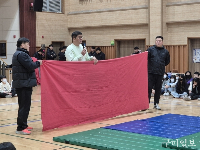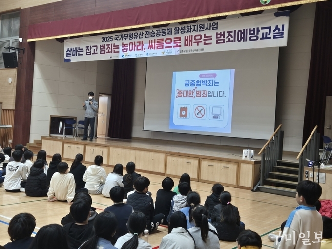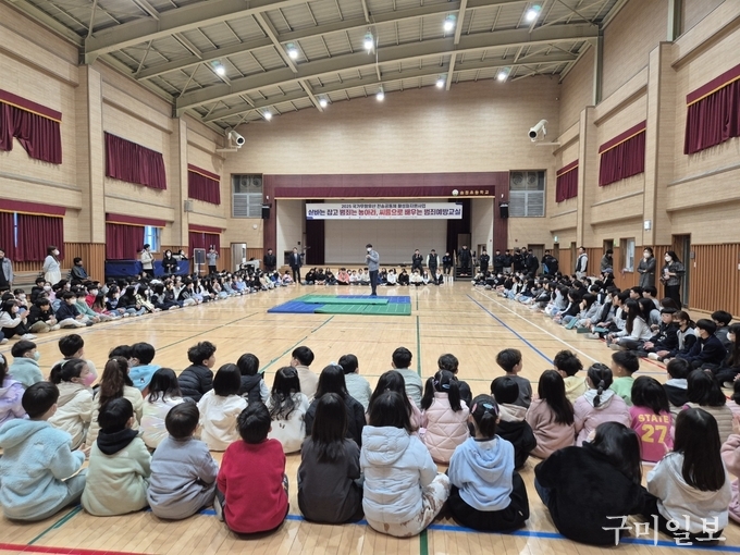 구미경찰서(서장 유오재)는 11월 6일, 송정초등학교와 형남초등학교를 잇달아 방문해 학생 500여 명과 함께한 「SPO 스쿨어택!」을 성공적으로 개최했다. 이날 두 학교 강당은 ‘모래판의 황태자’ 이태현 용인대 교수와 구미시청 씨름단이 총출동한 가운데 아이들의 힘찬 함성으로 가득 찼다.