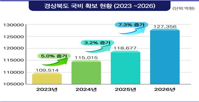 민선 8기 4년 전체를 보면 경상북도의 국비 확보 성과는 전국에서 가장 두드러진 것으로 평가된다. 이 기간 경상북도 국비 확보 총액을 보면 2023년 10조 9,514억원에서 2026년 12조 7,356억원으로 총 1조 7,842억원 증가했다. 지난해 전례 없는 국회 감액 예산 편성에서도 3.2% 증가율을 보인 것을 비롯해, 연평균 증가율이 5% 이상 지속된 것은 경상북도가 체계적이고 치밀한 국비 확보 전략을 꾸준히 실행해 왔음을 보여준다.