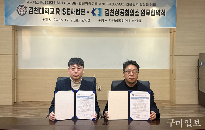 김천대학교(총장 윤옥현) RISE사업단은 김천상공회의소(회장 안용우)와 지역 인재 양성 및 중장년 맞춤형 일자리 지원을 위한 공동협력 업무협약(MOU)을 체결했다고 4일 밝혔다. 이번 협약은 김천대학교 RISE사업단(단장 윤경식)이 추진하는 평생직업교육체제 구축 사업(LCA)의 일환으로, 경북지역 만 30세 이상 성인학습자의 직업역량 강화와 중장년층의 취·창업 활성화를 위한 기반을 강화하기 위해 마련됐다.