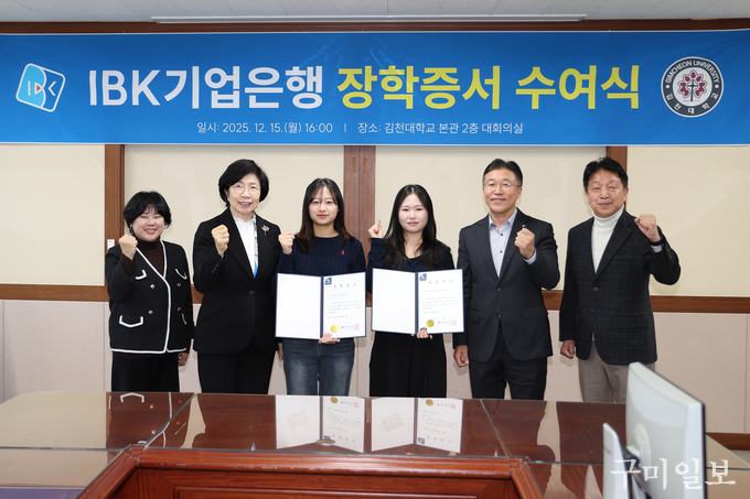 장학증서 수여식에는 윤옥현 김천대학교 총장, 정재원 IBK기업은행 김천지점장 등 관계자들이 참석했다.