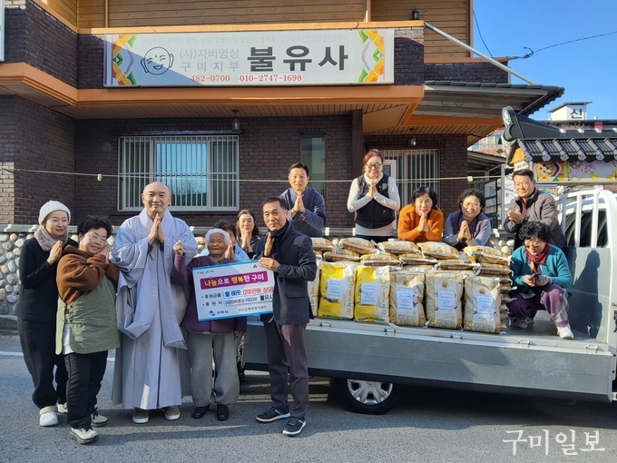 불유사는 선산읍 이웃에 따뜻한 마음을 전하고자 꾸준한 기부를 통해 선행을 실천하고 있다. 이날 기탁된 쌀은 선산읍에 위치한 노인복지시설을 비롯한 독거노인, 장애인가구 등 복지사각지대에 놓인 이웃들에게 전달 될 예정이다.