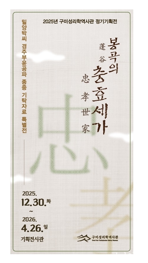 구미성리학역사관은 12월 30일부터 2026년 4월 26일까지 밀양박씨 경주부윤공파 기탁자료 특별전 『봉곡의 충효세가』를 개최한다.