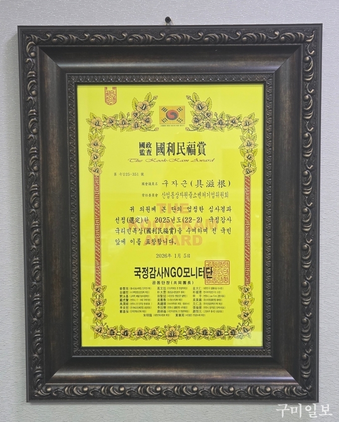 구자근 국회의원(구미갑, 산업통상자원중소벤처기업위원회)이 법률소비자연맹 국정감사 NGO 모니터단이 선정한 ‘2025년도 국정감사 국리민복상’ 수상자로 선정됐다.