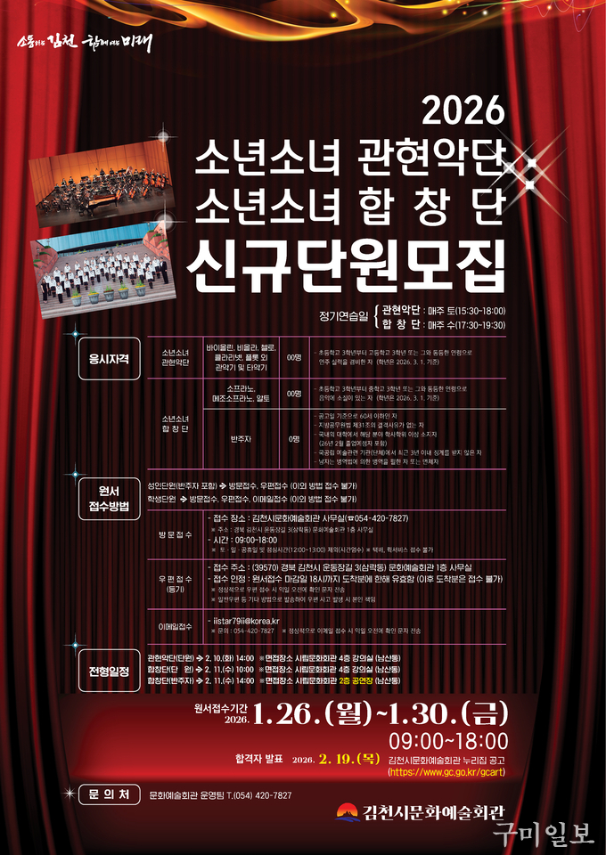 김천시 문화예술회관은 김천 문화예술의 미래를 이끌어 갈 시립예술단 신규단원을 모집한다.