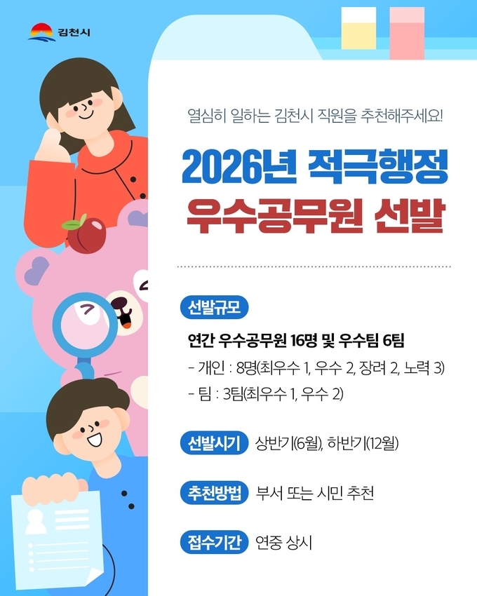 김천시(시장 배낙호)는 행정서비스 향상과 공익 증진, 사회문제 해결을 위해 2026년도 적극행정 우수공무원을 선발한다고 밝혔다.