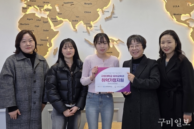 지난 28일 진행된 구미시가족센터에서 진행된 전달식에서 구미대 유아교육과 이소연·백유진 학생과 이지예 교수는 도근희 구미시가족센터장에게 유아교육과 대표 행사인 이쁘동이제 운영 수익금 50만원을 전달했다.