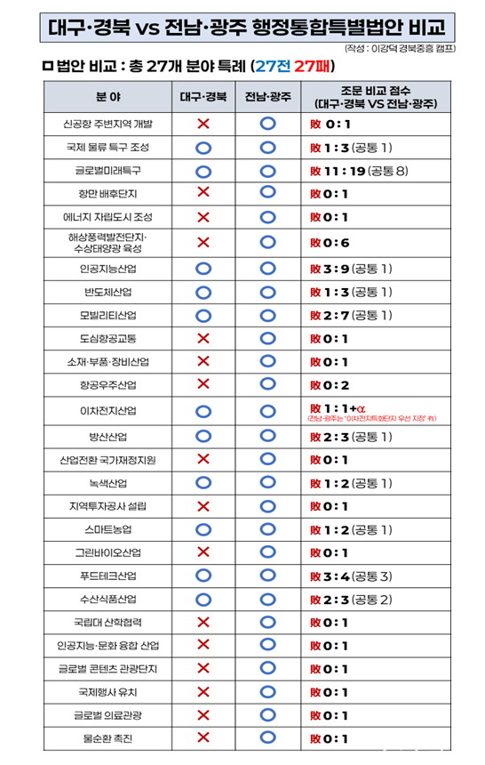 이 예비후보는 "제가 대구·경북과 전남·광주 특별법안의 특례 규정을 전수 비교한 결과, ‘27전 27패’라는 참담한 현실이 드러났다"면서 "두 특별법안을 비교하면서 너무 자존심이 상하고 분노가 치밀어 올라 말문이 막힐 지경이었다"고 소회를 밝혔다.