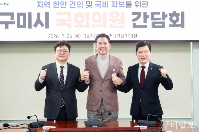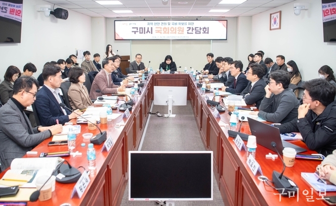 구미시는 2월 26일 국회에서 구자근, 강명구 지역구 국회의원과 김장호 시장을 비롯한 시 주요 간부 공무원 등 30여 명이 참석한 가운데 지역 주요 현안 해결과 국비 확보를 위한 국회의원 간담회를 개최했다.