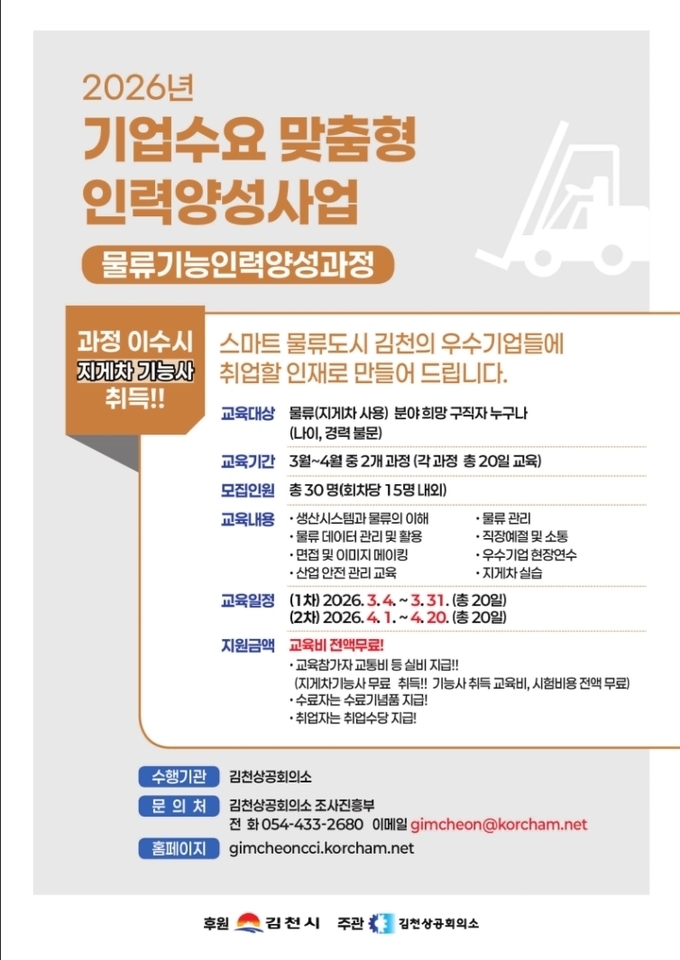 이번 과정은 스마트 물류도시로 거듭나고 있는 김천시의 산업 구조 변화에 대응하고, 물류 일자리에 맞춤형 인력 양성과 취업연계를 통해 산업 경쟁력을 제고하기 위해 매회 15명씩 총 30명의 교육생을 모집해 진행될 계획이다.
