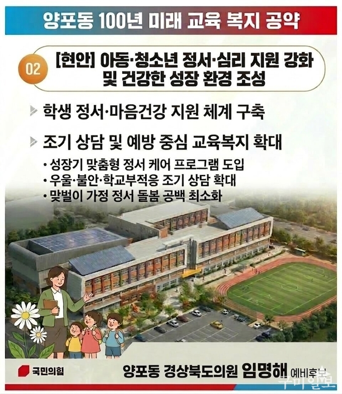 임 후보는 최근 발표한 ‘양포동 100년 미래 교육 발전 공약’ 가운데 ‘아동·청소년 정서·심리 지원 강화 및 건강한 성장 환경 조성’ 정책을 통해 학생들의 마음 건강을 체계적으로 지원하는 교육복지 확대 방안을 밝혔다.