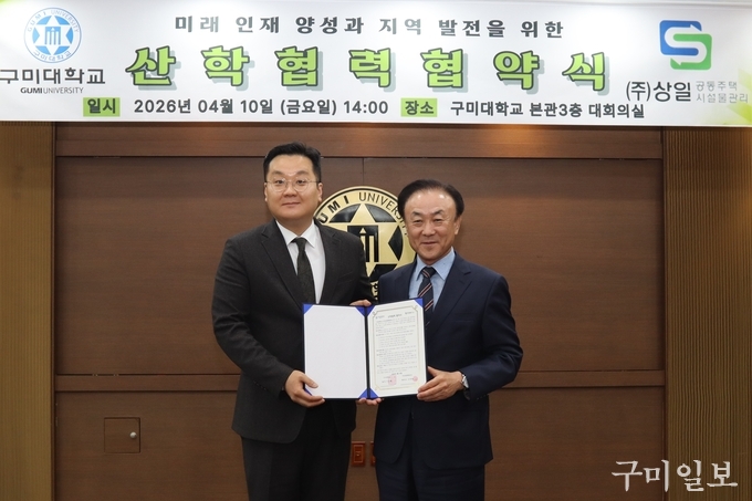 구미대학교 반도체전자통신공학부(학부장 전현민)가 공동주택 위탁관리 전문기업인 (주)상일종합관리(대표이사 이후봉)과 재직자 평생학습과정 운영 및 직무능력 향상을 위한 산학협약을 가졌다고 13일 밝혔다.
