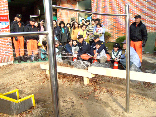 은광어린이집 현황으로는 1990년도 5월에 봉곡동 217-13번지에 사회복지법인으로 설립되었으며, 원장 포함 교사 35명이고, 현재 중증장애인 83명(정신지체 24명, 뇌병변 25명, 발달장애 10명, 지체장애 4명,시각장애 1명,지적장애4명,기타 13명)이 입소되어 있다. 이번 소방안전교육에는 원평119안전센터 소방관 4명, 원평의용소방대 20명 소방차량 2대가 동원되었으며, 심폐소생술, 화재시 신고 및 대피요령, 자체소방시설이용 진압훈련 순으로 실시하였다. 또한 교육 후에는 보육시설 환경 정화(청소,빨래) 및 빵과 우유를 제공하였으며, 원평119안전센터장(권정택)은 이번 교육으로 중증장애인들에 대한 안전의식을 다시 한번 생각하는 계기가 되었으면 한다고 말했다. |